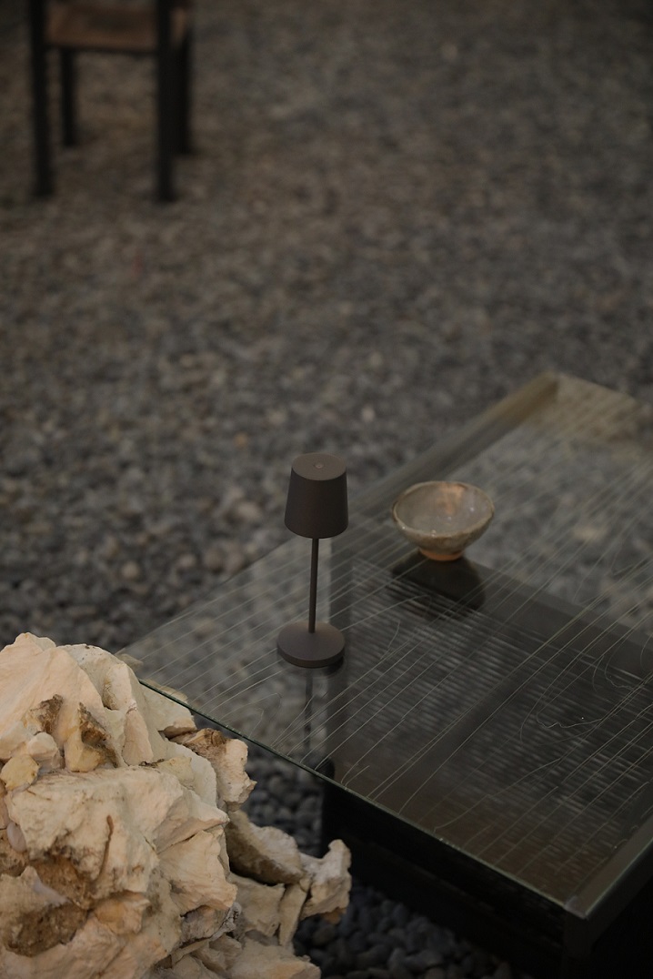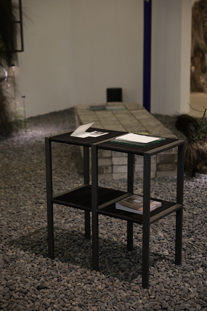 Di antara kursi-kursi serta bench dengan bentuk yang beragam, hadir pula side table dan standing table terbuat dari material kaca. Uniknya, permukaan kaca dari brand Himalaya Abadi ini miliki tekstur unik dengan garis-garis menyerupai guratan pada permukaan kayu yang didesain khusus oleh FFFAAARRR untuk instalasi ini. Di bawah cahaya dan saat dilihat lebih dekat, permukaan meja pancarkan warna biru kehijauan yang subtle sebagai aksen warna yang lembut di antara ruang bernuansa monokrom.
