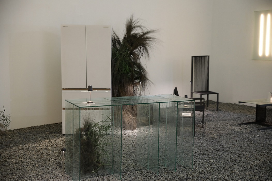 Tak hanya mengiringi pathway, tapi lampu juga jadi pendar cahaya menyinari elemen-elemen furnitur pada instalasi. Selain itu, lighting juga hadir seperti sebuah karya seni saat disusun membentuk rentetan garis vertikal menyinari permukaan kaca yang seolah dibingkai dalam sebuah kanvas lukisan.