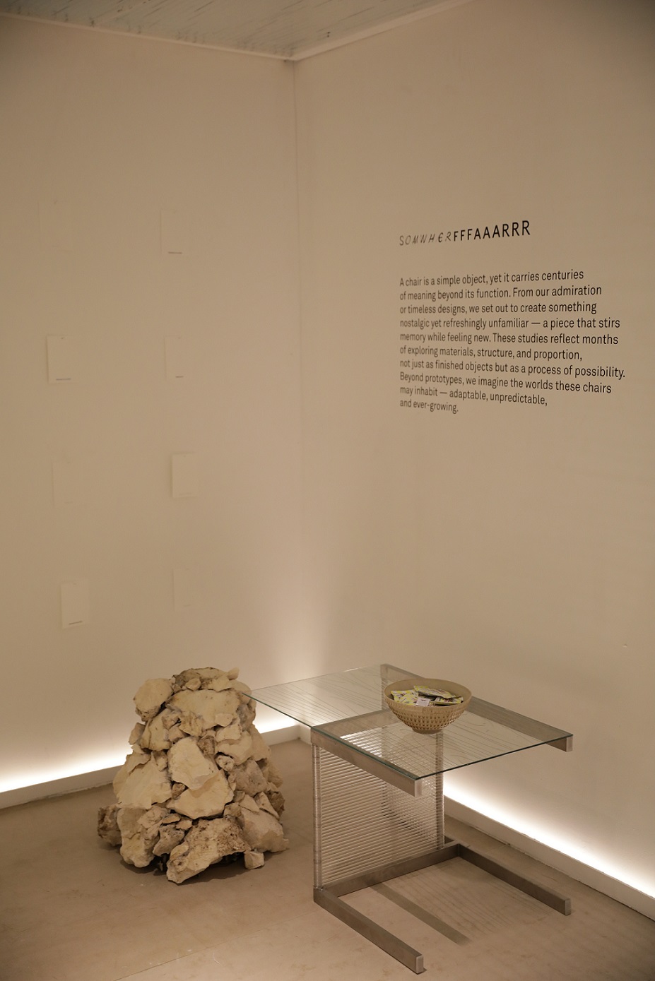 Sebaliknya, arsitek Fauzia Evanindya, Andro Kaliandi, dan Azalia Maritza dari FFFAAARRR menciptakan poetic space bergaya minimalis yang mengeksplorasi materialitas dalam ruangnya. Berkolaborasi dengan Somwher, karya ini diberi nama Something Close from Somwher FFFAAARRR yang merupakan manifestasi impian arsitek dalam meluncurkan produk furnitur. Dalam instalasi ini hadir tiga hal yang membuat karya FFFAAARRR di VIP Lounge Art Jakarta makin istimewa.
