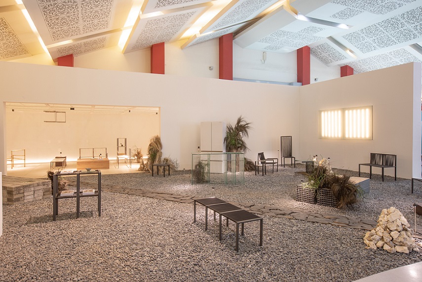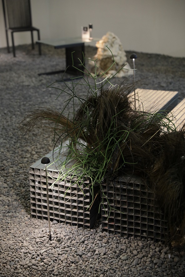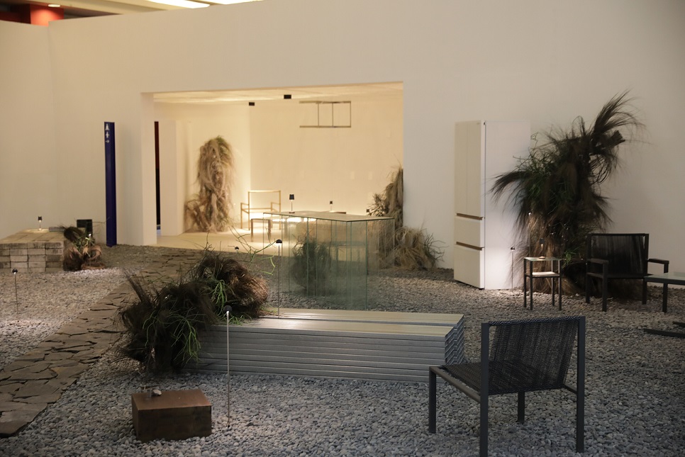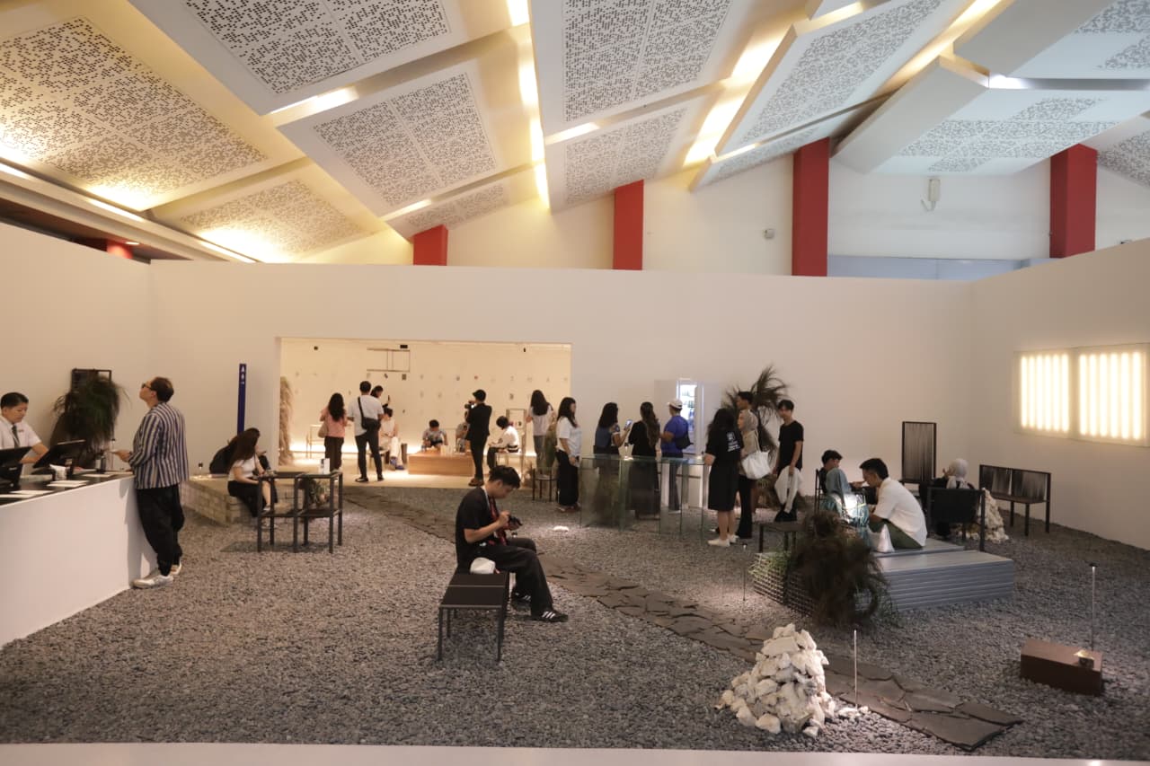 Deretan kursi tersebar dalam imaginary space yang terdiri dari material monolithic yang representasikan adaptibilitas dan versatility yang terbangun dengan apik berkat dukungan penuh dari Kreasindo Cipta Pratama sebagai kontraktor. Secara garis besar, pengunjung diajak melangkah dan mengeksplorasi ruang menyerupai taman yang dilapisi bebatuan kecil pada lantainya.