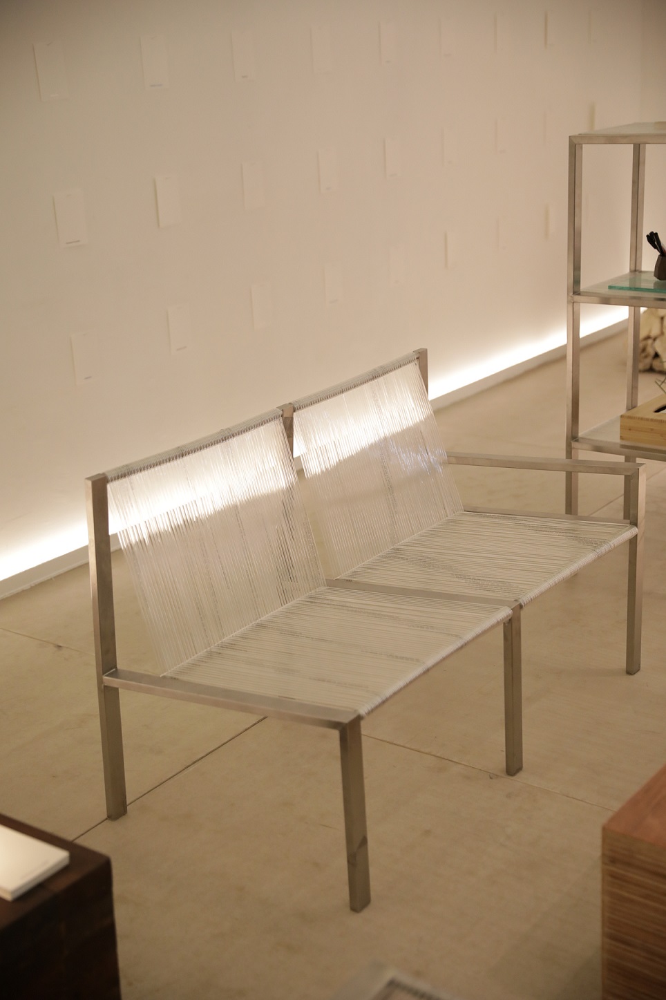 Furnitur yang ada representasikan eksplorasi arsitek akan metode weaving lewat penggunaan material unik sebagai dudukan dan sandaran kursi. Untuk kursi berkerangka silver tampak menggunakan polyurethane hose, sedangkan kursi berwarna hitam gunakan black paracord. Penerapan kedua material mewakilkan visi arsitek yang ingin mempertanyakan ulang pengalaman duduk dan mengundang para pengunjung untuk coba serta berdiskusi usai ikut duduk di ruang instalasi ini.