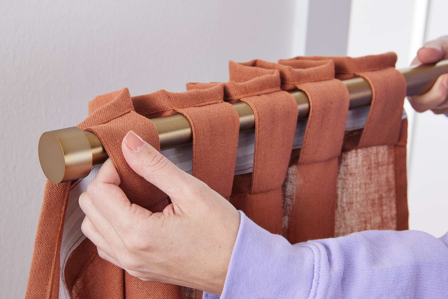 Selanjutnya adalah menyiapkan tiang gorden. Beberapa jenis gorden memerlukan cincin untuk menggantung gorden. Jenis gorden lainnya memiliki lubang yang bisa dimasukkan tiang gorden. Pastikan cincin gorden sudah terpasang di tiang sebelum dikunci di bracket gorden. Setelah terpasang, putar kunci bracket di sudut kanan dan kiri hingga tidak bergoyang.