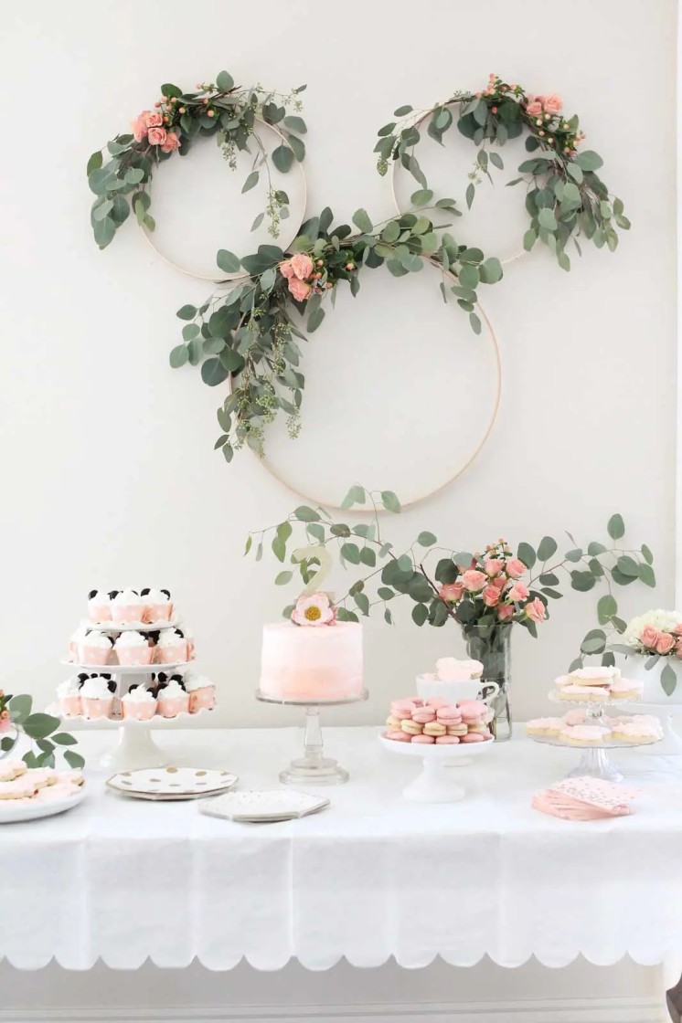 Ini adalah dekorasi sederhana tapi tetap cantik. Rangkaian daun hijau dan bunga pink dalam hoop lingkaran menciptakan kesan alami dan segar. Daun yang menjuntai memberikan kesan natural flowy. Tidak perlu backdrop khusus, cukup gunakan dinding polos sebagai latar belakang.