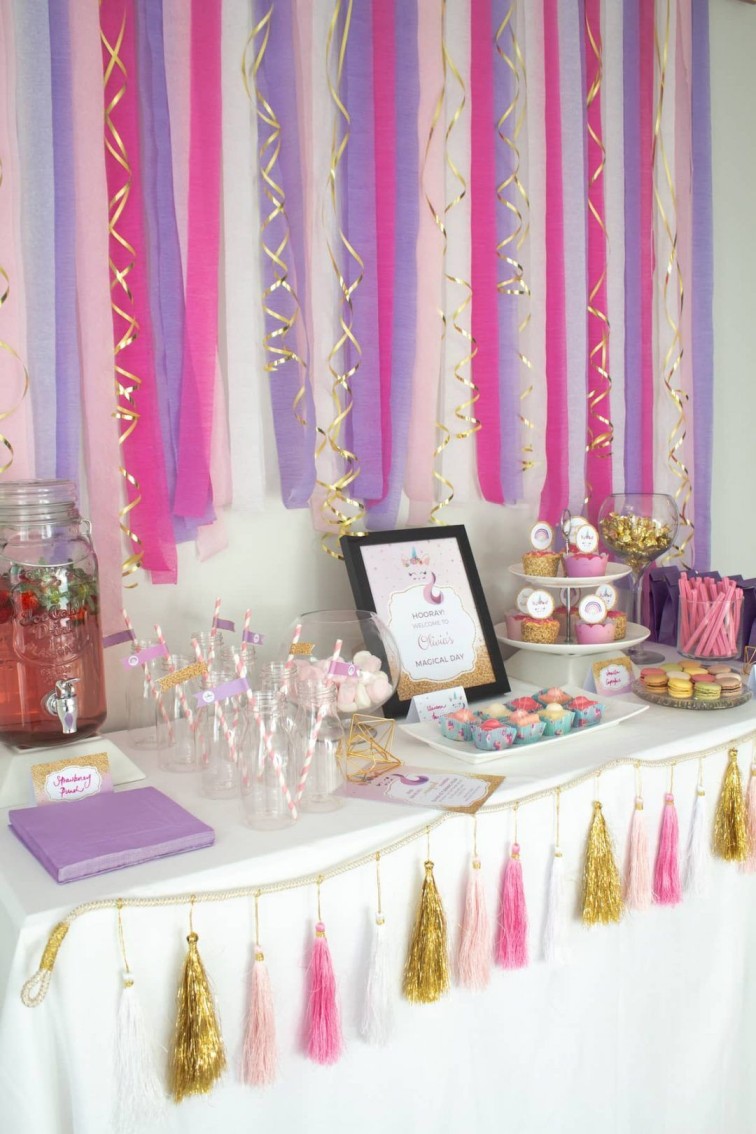 Dekorasi dengan kertas krep dan metalik bisa menciptakan suasana pesta yang semarak dan penuh warna. Kertas krep berwarna lembut seperti pink, ungu, dan putih digantung dari atas sebagai latar backdrop. Tambahkan aksen gold dari kertas metalik untuk kesan glamor. Biaya yang terjangkau tetap bisa menghasilkan dekorasi yang menarik.