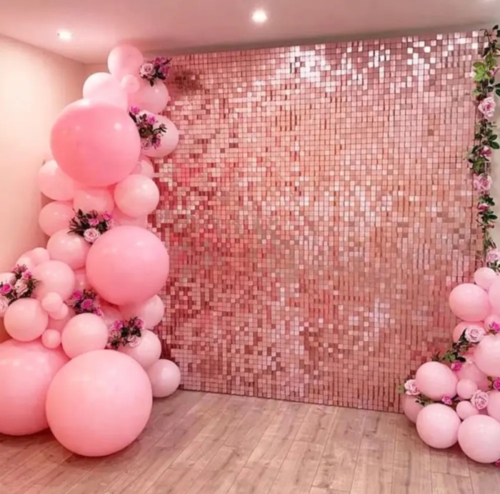 Sequin wall panel cocok untuk pesta yang ingin terlihat glamor dan elegan. Kilauannya mampu memantulkan cahaya, sehingga ruangan terasa lebih hidup. Kombinasikan dengan bunga artifisial berwarna pink untuk menambah kesan romantis dan manis. Balon besar dan kecil bisa dipadukan untuk memberikan dimensi yang menarik.