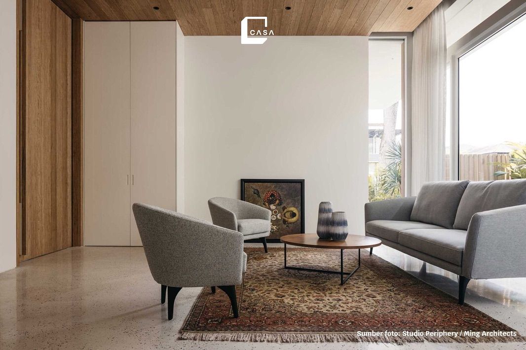 Denah open space mengoptimalkan penggunaan ruang agar terasa lebih luas. Ruang tamu dan ruang makan dibuat terbuka dan terhubung. Dua kamar tidur ditempatkan di sudut rumah untuk memaksimalkan cahaya alami.