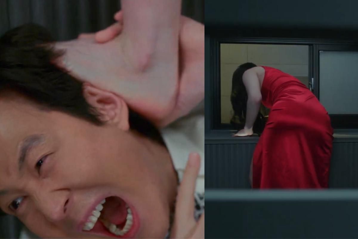 4. Karena kaget, Hyeon Jun dipaksa menopang tubuh Jeong Sin agar bisa memanjat. Bahkan, lehernya harus diinjak oleh perempuan itu.