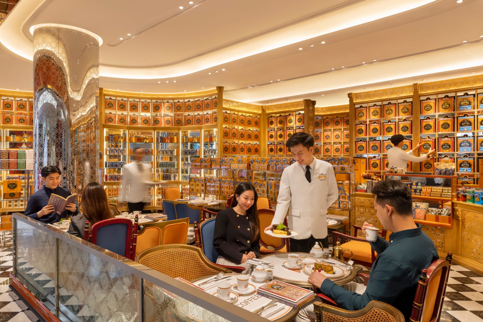 Ritual minum kopi di sini menjadi pengalaman multisensori. Para Coffee Master menyajikan kopi dari teko emas ke dalam cangkir porselen, penuh ketelitian dan keanggunan. Lebih dari 200 ragam kopi 100% Arabika dapat dipadukan dengan menu spesial yang hanya tersedia untuk bersantap di tempat.