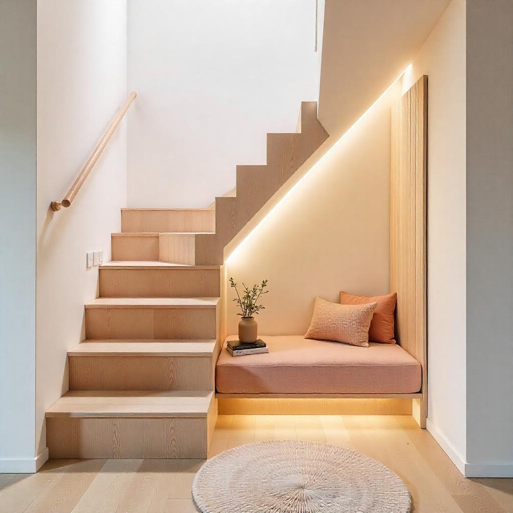 Tangga rumah sempit dapat dimanfaatkan secara multifungsi dengan menghadirkan area baca di bagian bawahnya. Bagian tembok samping tangga juga bisa dimaksimalkan sebagai tempat penyimpanan, misalnya rak buku atau laci. Dengan desain ini, aktivitas membaca atau menyimpan barang tidak memerlukan ruang tambahan. Setiap sudut tangga menjadi fungsional tanpa mengurangi sirkulasi atau estetika rumah. Konsep seperti ini membuat rumah terasa lebih terorganisir, rapi, dan nyaman untuk berbagai kegiatan sehari-hari.