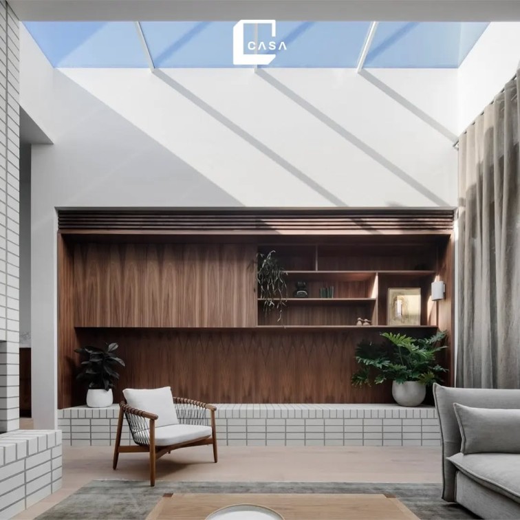 Kehadiran skylight besar di bagian atasnya memungkinkan cahaya alami masuk secara maksimal, membuat ruang tamu terasa lebih terang, luas, cozy, dan hangat sekaligus menonjolkan keindahan material kayu. Model dinding ruang tamu kombinasi keramik ini menghasilkan tampilan ruang tamu yang minimalis, estetik, dan sangat bergaya.