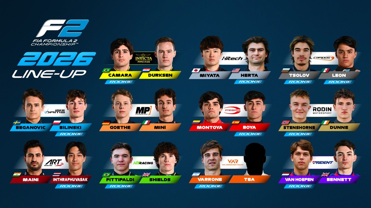 Pembalap Brasil, Emerson Fittipaldi, akan bergabung dengan F2 pada 2026 dari Kejuaraan Eurocup-3, dan setelah bertahun-tahun sukses di balap mobil sport (ia memenangi Kejuaraan Dunia Ketahanan 2023 dan 24 Hours of Le Mans di kelas LMGTE Am), pembalap Argentina Nicolas Varrone akan melakukan debutnya di F2 bersama Van Amersfoort Racing (VAR).