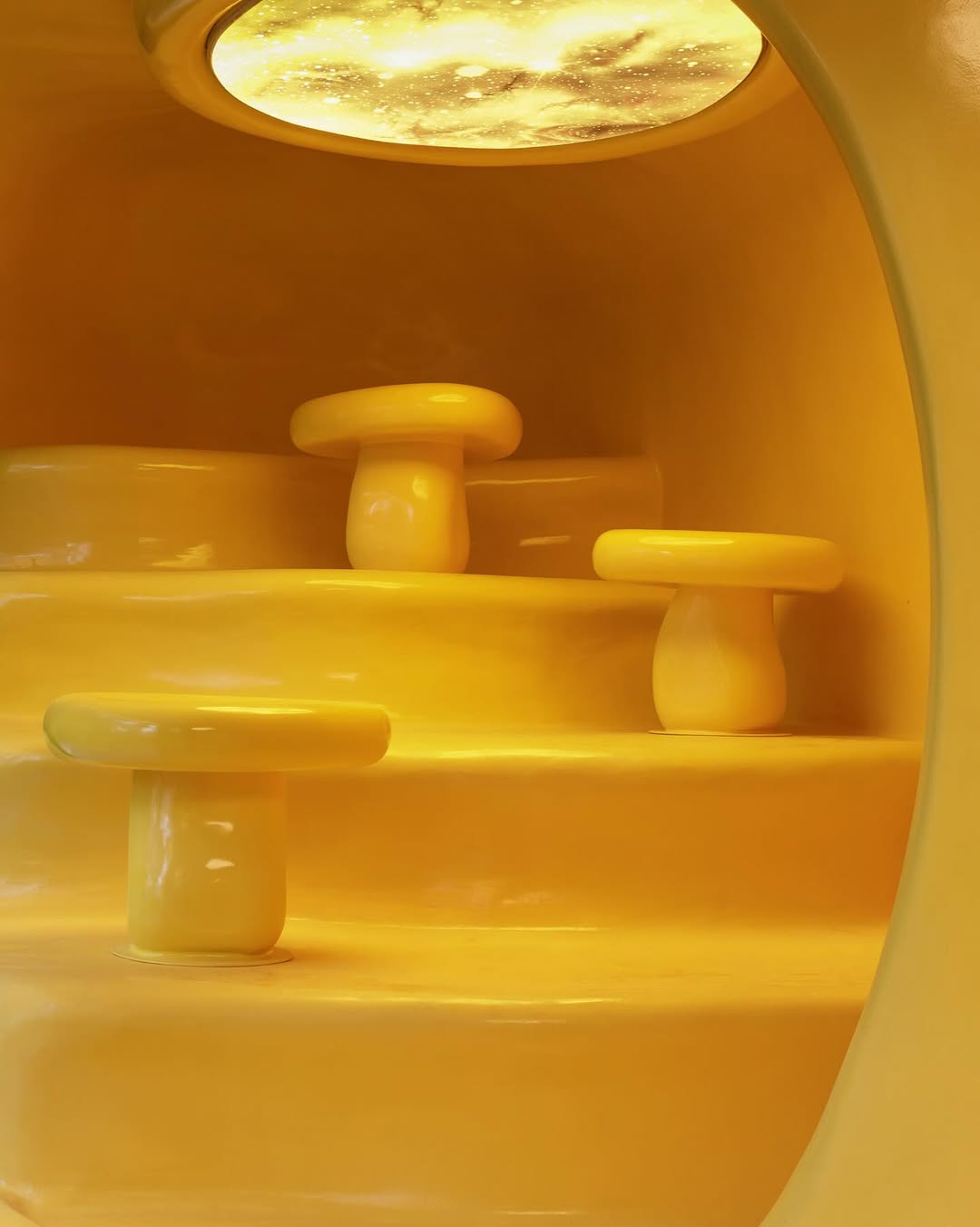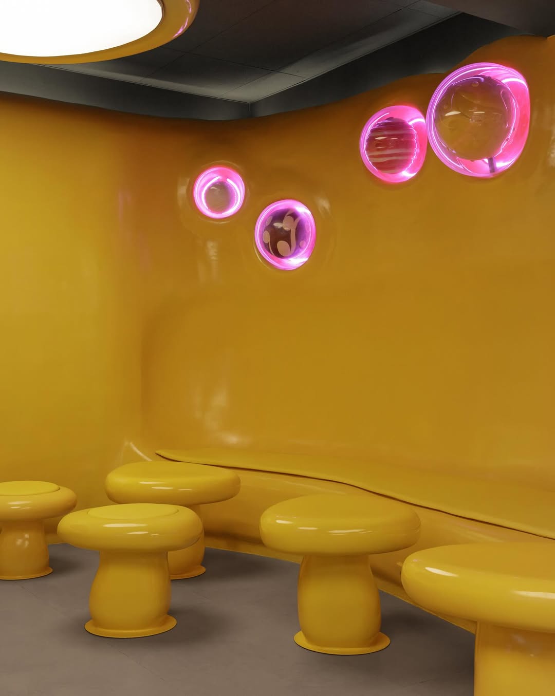 Desain ruangan di Butter Baby memberikan pengalaman spasial yang unik. Ruangan ini dirancang dengan geometri organik, permukaan mengkilap, dan cahaya yang menyebar. Dinding, pencahayaan, dan perabotan dilapisi rona kuning seperti warna mentega yang pekat. Dinding melengkung seperti kepompong dan tempat duduk bawaan membangkitkan suasana habitat alien yang dirancang untuk membawa pengunjung ke dimensi rasa manis.